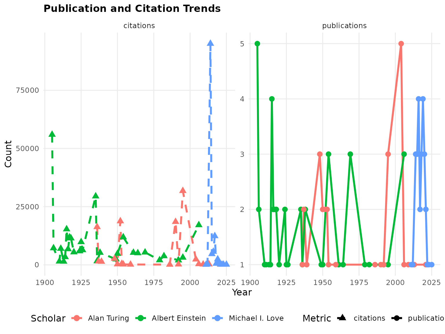 trends <- AnalyzeCitationTrends(list(scholar1, scholar2, scholar3), time_period = "10y")