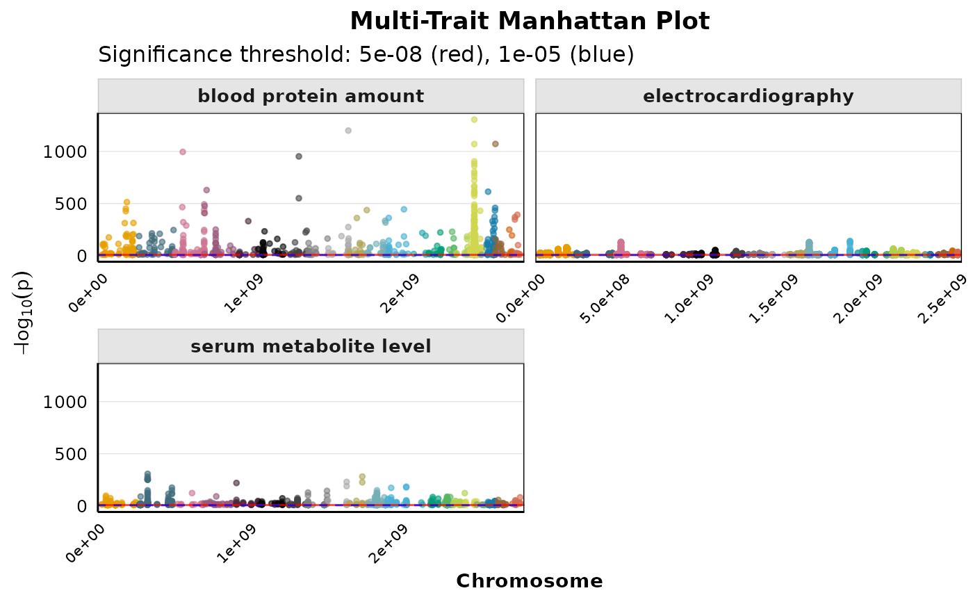 Creates a faceted Manhattan plot showing genome-wide associations for multiple traits simultaneously. Each panel represents a different trait, making it easy to compare patterns across traits.